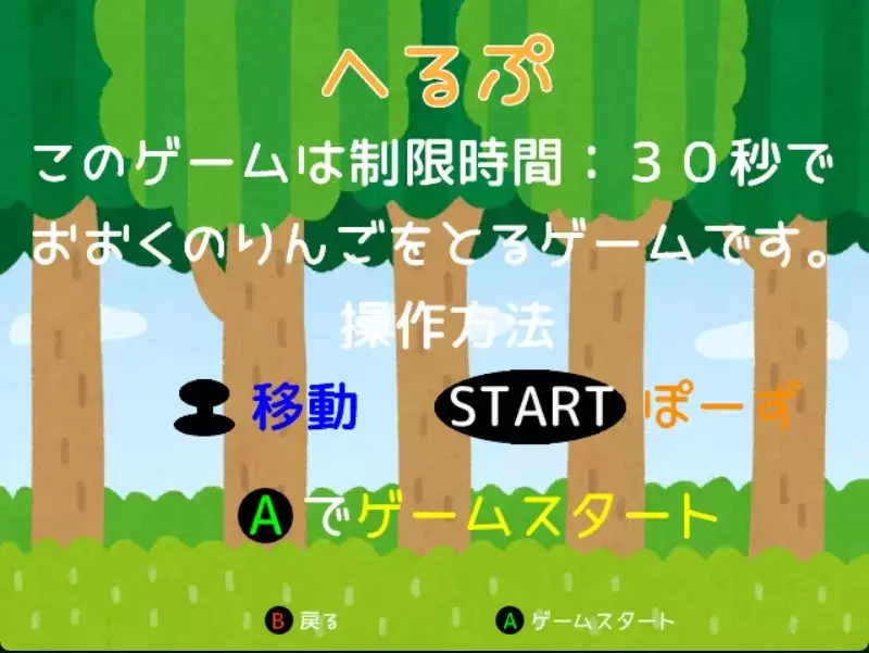 りんごおとし AppleDrop_PreviewAppleDrop_PlayAppleDrop_Play2AppleDrop_Play3 このゲームは制限時間30秒以内により多くのりんごを取り、スコアを競うゲームです。 コントローラーの入力方式:DirectInput・XInput両対応。 開発環境DXライブラリ開発期間約1ヶ月半担当箇所プレイヤー、各シーンのUI GitHubGitHub ダウンロード 目次 りんごおとし 操作方法 タイトル画面 ゲーム画面 ランキング名前入力画面 操作方法 タイトル画面 入力操作アナログスティック上下左右選択A決定B戻るBACKゲーム終了 ゲーム画面 入力操作アナログスティック左右プレイヤー左右移動STARTポーズBACKゲーム終了 ランキング名前入力画面 入力操作アナログスティック上下左右選択A入力B1文字削除START名前確定